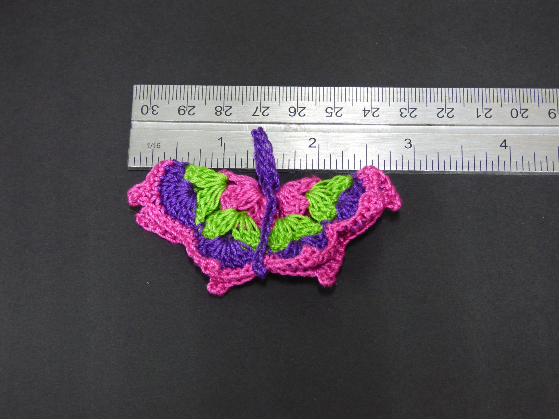Add a pop of color to your top, bag, jacket, or craft project with these hand crocheted butterfly appliques! Each butterfly is crocheted by hand inhouse. Because these are handmade, exact measurements will vary from butterfly to butterfly. However, they measure approximately 1.5" (38mm) tall and approximately 2.8" (71mm) wide.