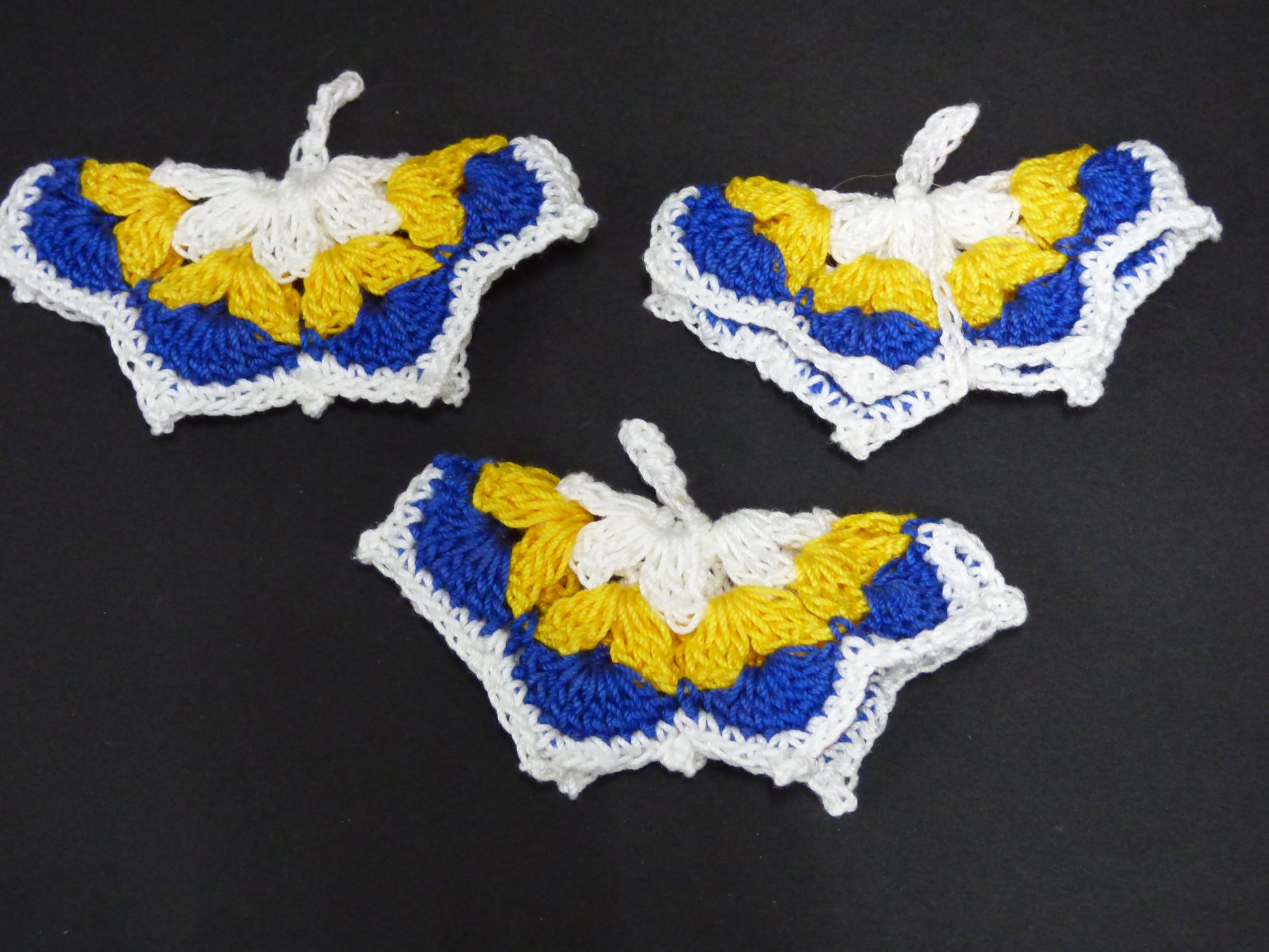 Hand Crocheted Butterfly Applique 3 Piece Set White, Yellow, and Blue
