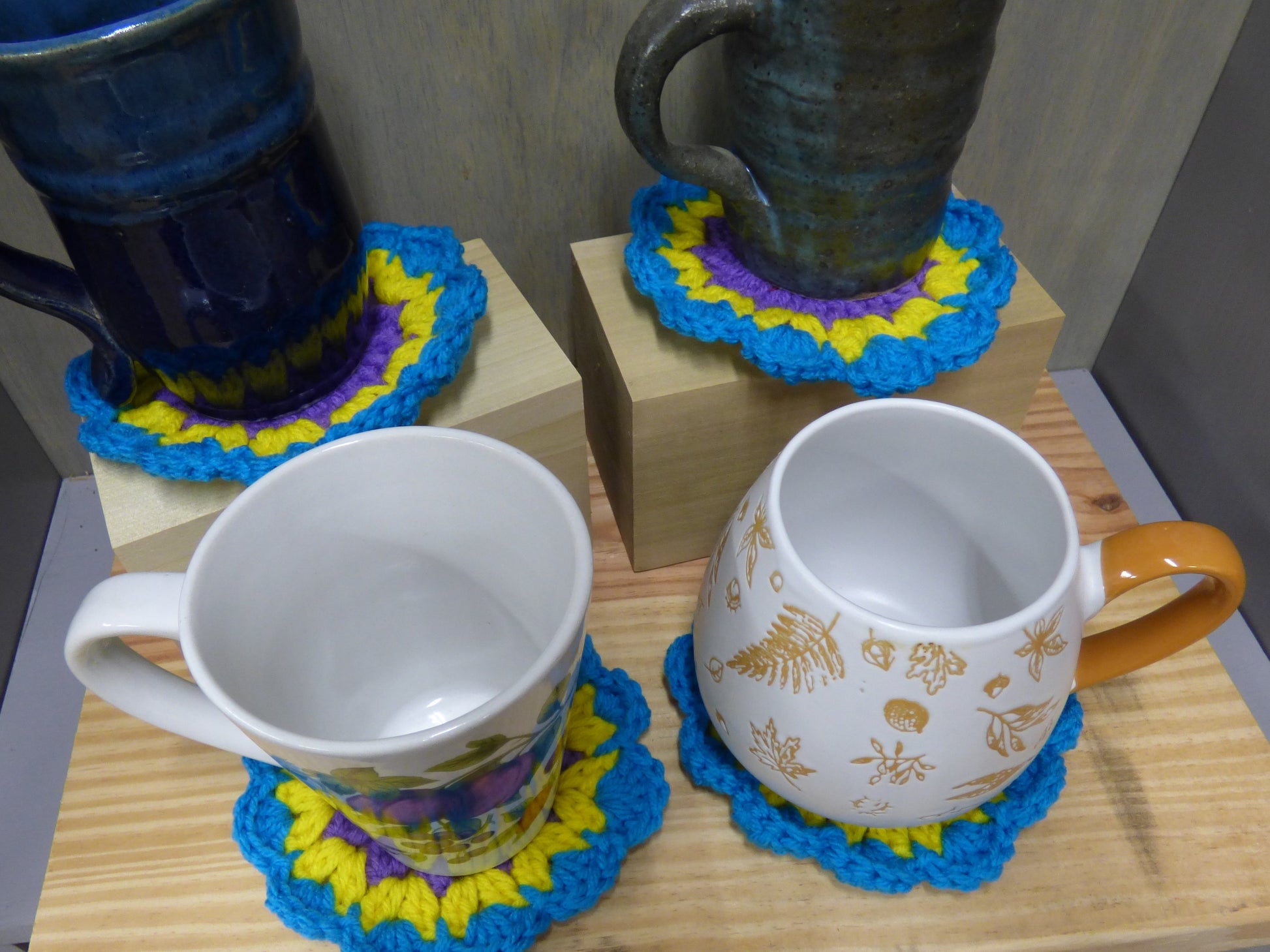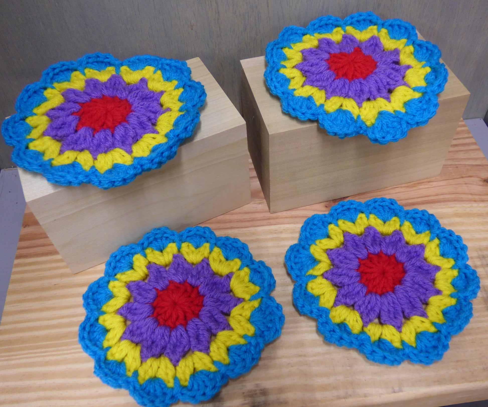 Hand Crocheted Coasters Four Piece Set Blue, Yellow, Purple, and Red