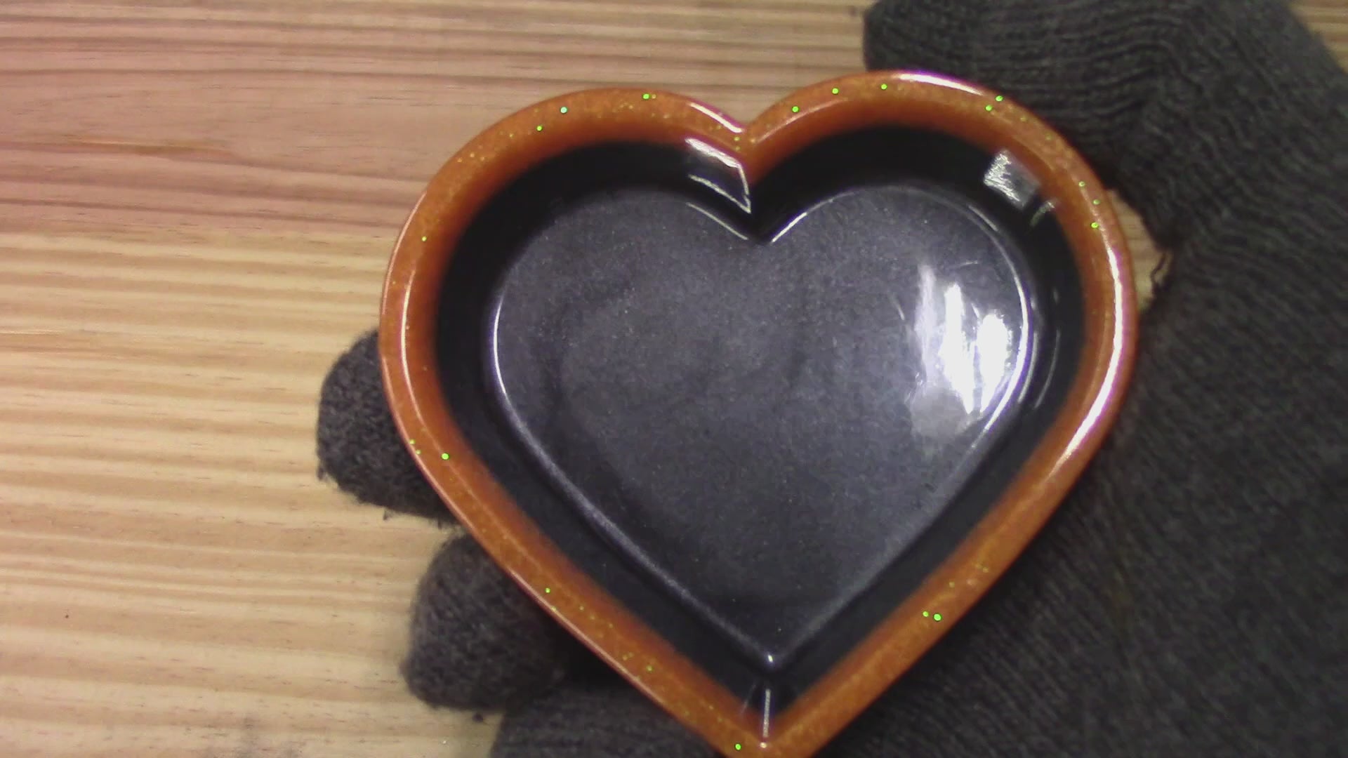 The bottom of the dish is a custom mix of silver and black pigment powders that give the piece a dark yet silvery shimmer. Highlighting the top is as an orange mica with flecks of green sparkle.