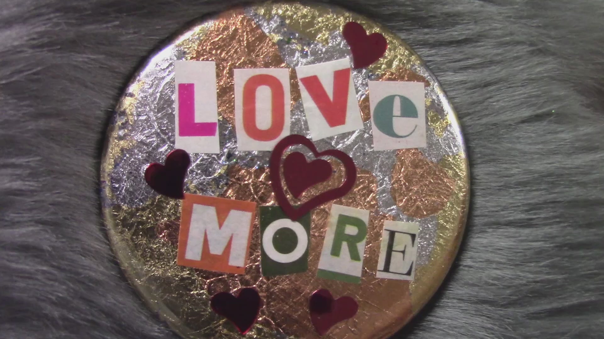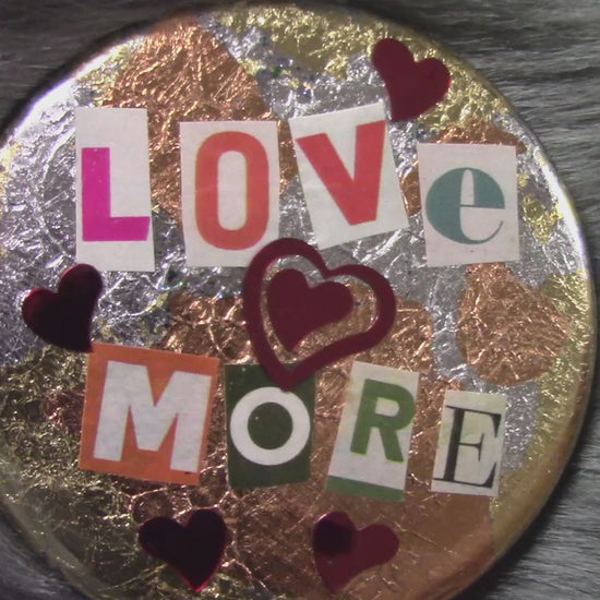 The words Love More are clipped from a magazine that was otherwise destined for the landfill. The gold, silver, and copper tone background is actual hand laid metal leaf on the button shell. The button also features red sequin hearts. This button measures approximately 2.25” or 58mm.