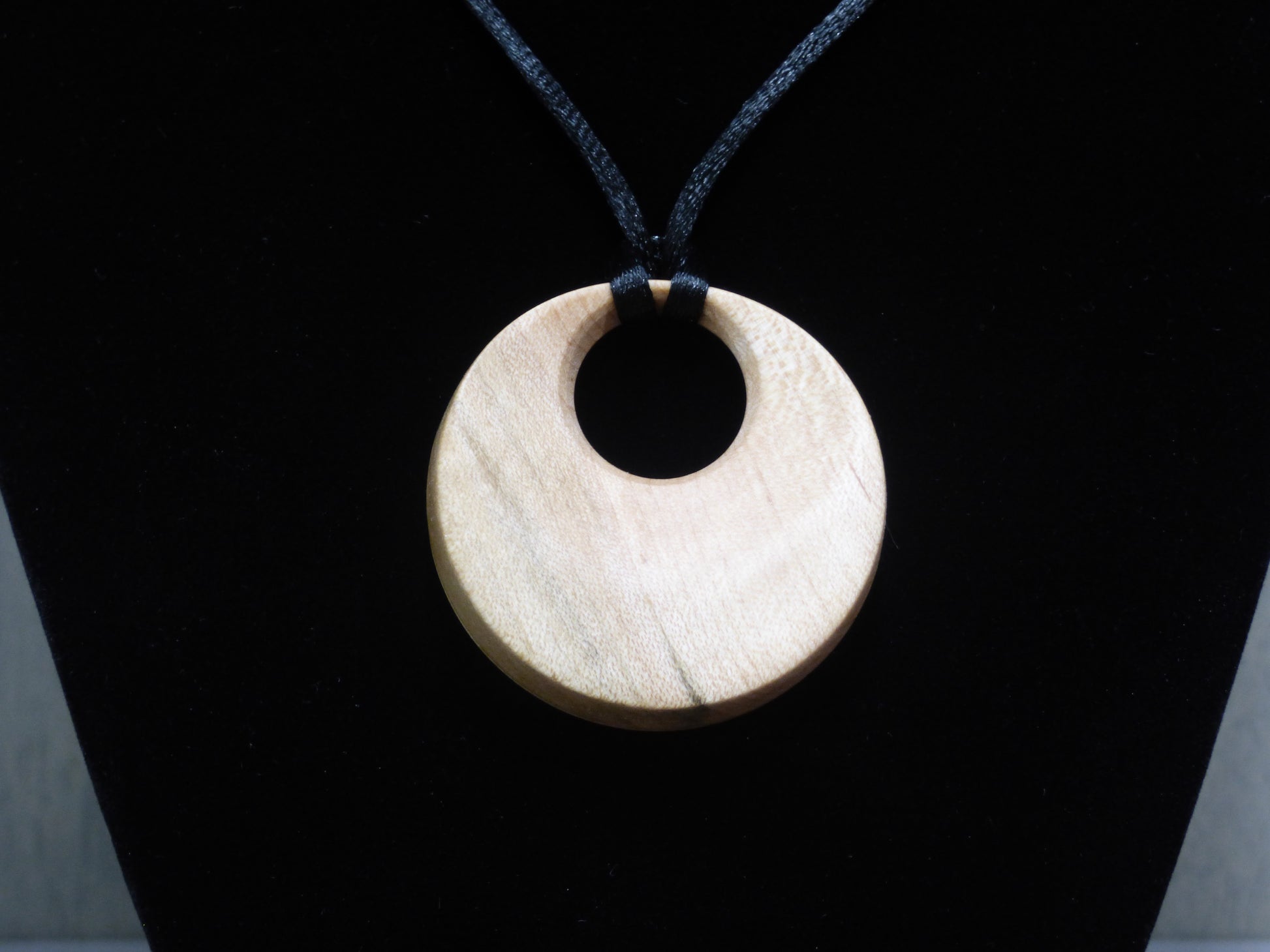 An understated beauty that has been handcrafted from hard maple and features some interesting streaks running through the grain. Both sides of this pendant feature striking grain patterns that "shift" when turned in the right light. So, there is no front or back to this pendant. Totally reversible!