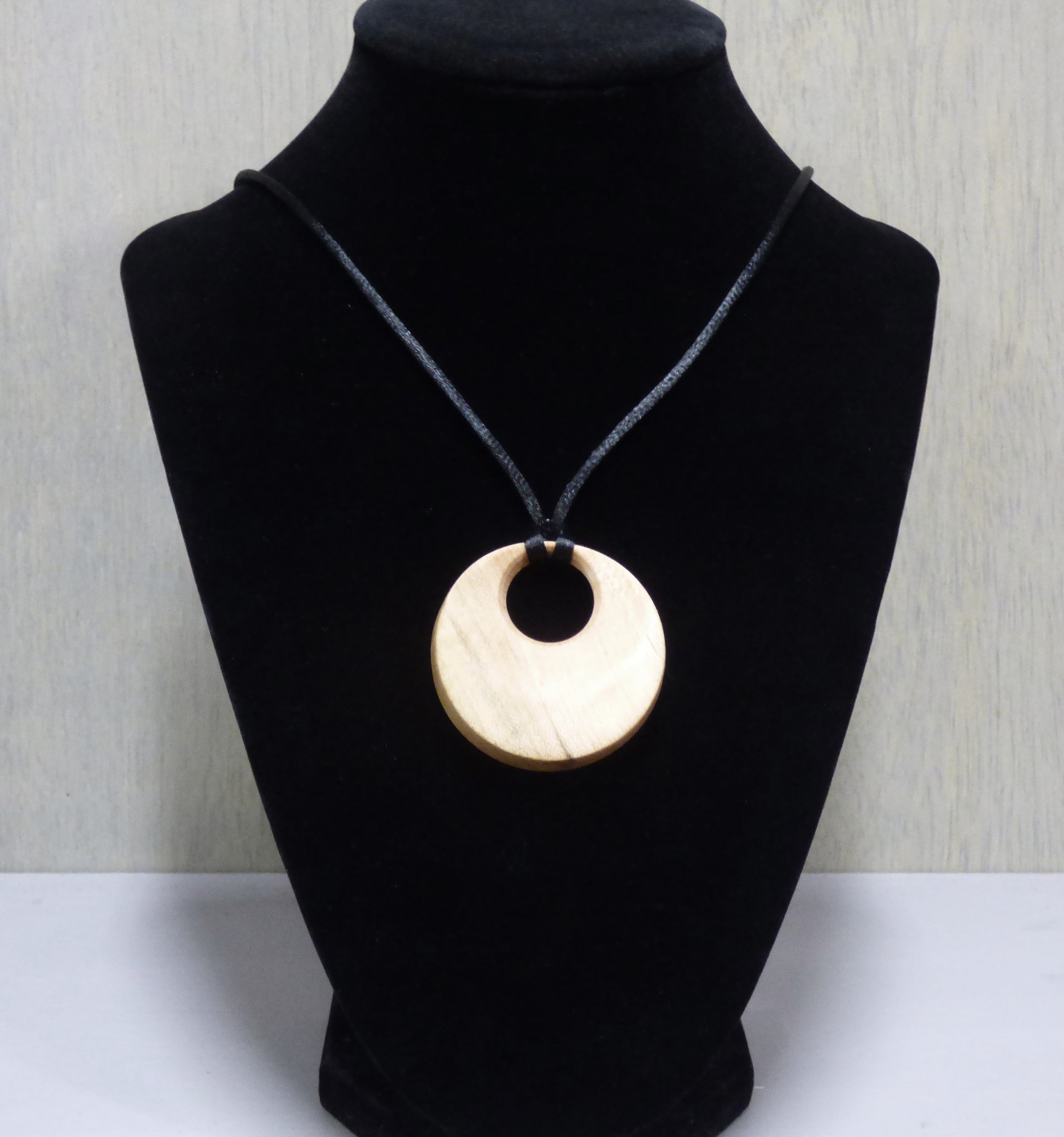 This pendant was turned by hand on a wood lathe in our shop. It was then sanded and treated with a non-toxic oil finish. Finally, it was polished and buffed with carnauba wax. It's finished off with a 2mm black leather cord in your choice of length.
