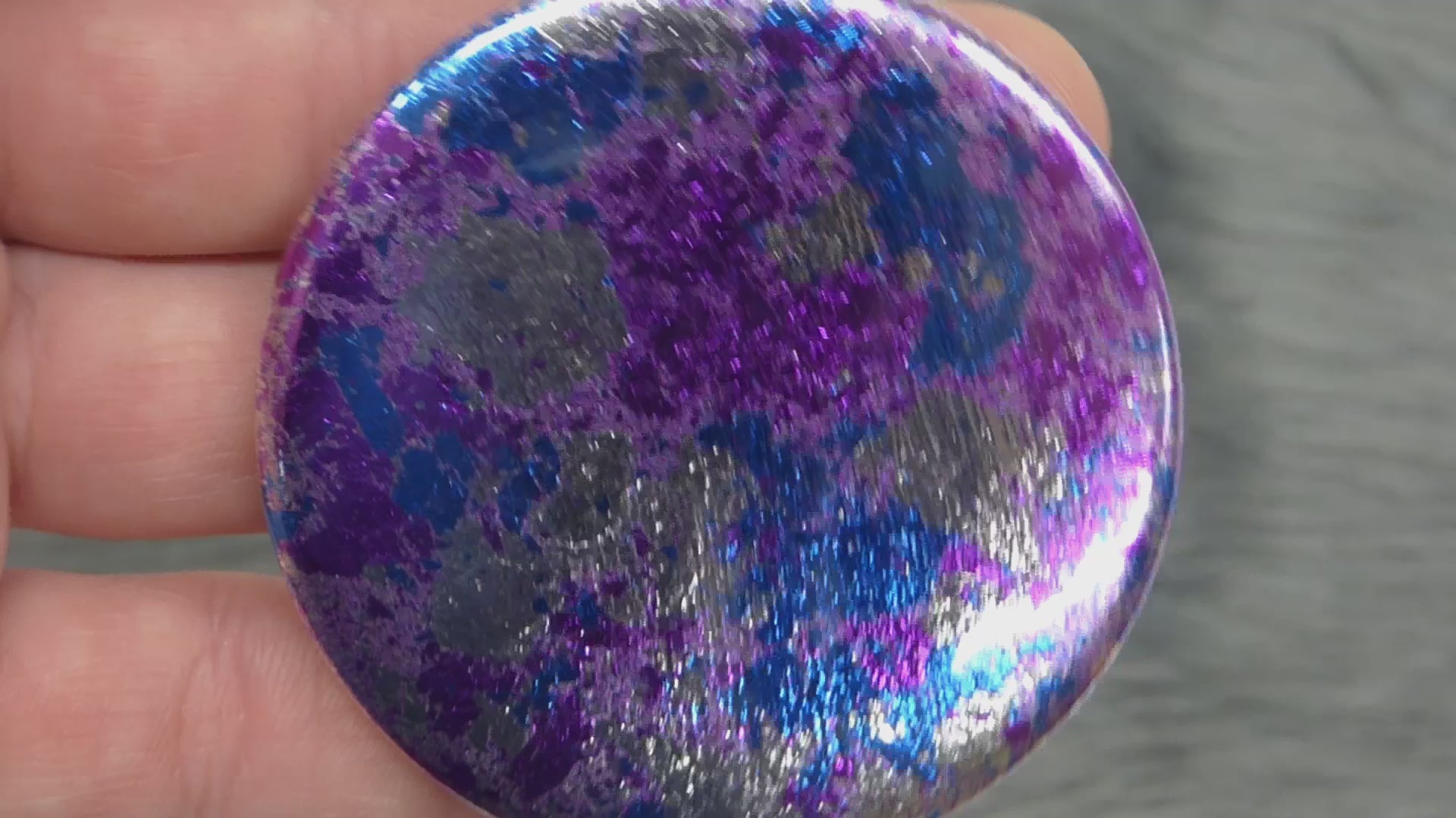 This button doesn't feature any words or images. The silver, blue, and purple tone background is actual hand laid metal leaf on the button shell. This button measures approximately 2.25” or 58mm.